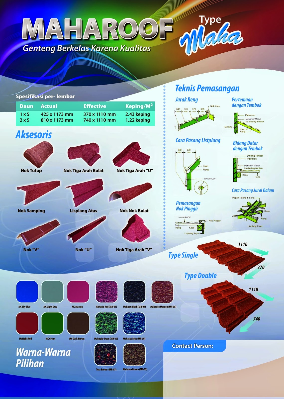 Genteng Metal yang super datar selalu pas apapun gaya atap rumahmu. Profilnya yang sangat datar membuat mahaflat terlihatek eksklusif dan sangat mudah untuk dipasang. Bisa dipasang pada jenis atap Datar, Cembung, Cekung, ataupun Gelombang.